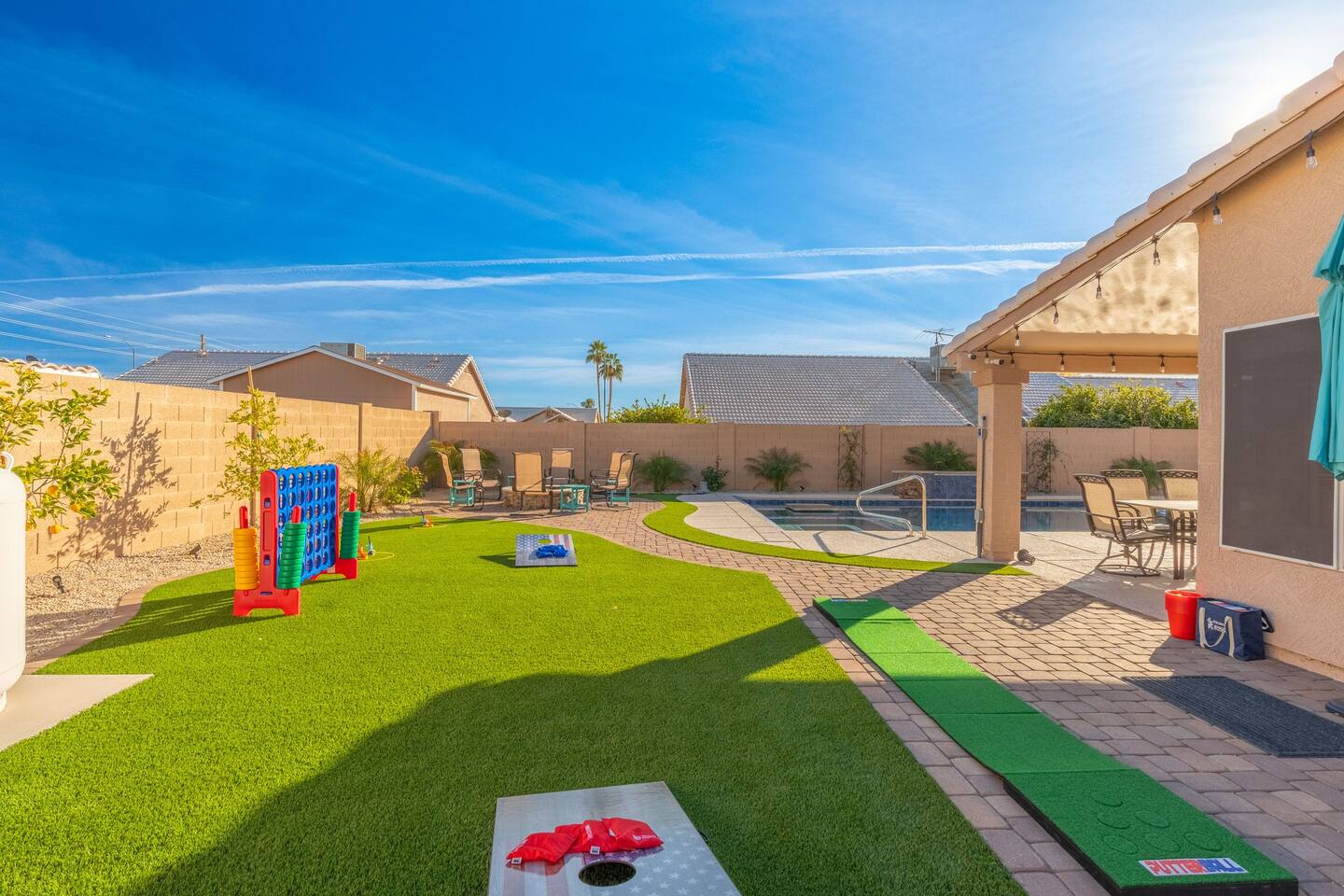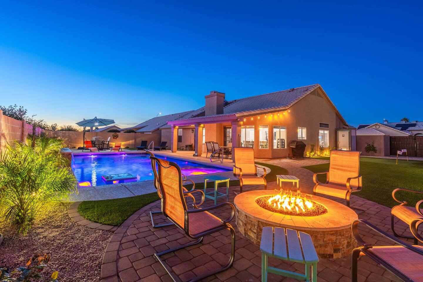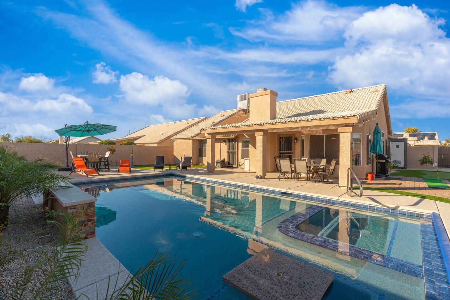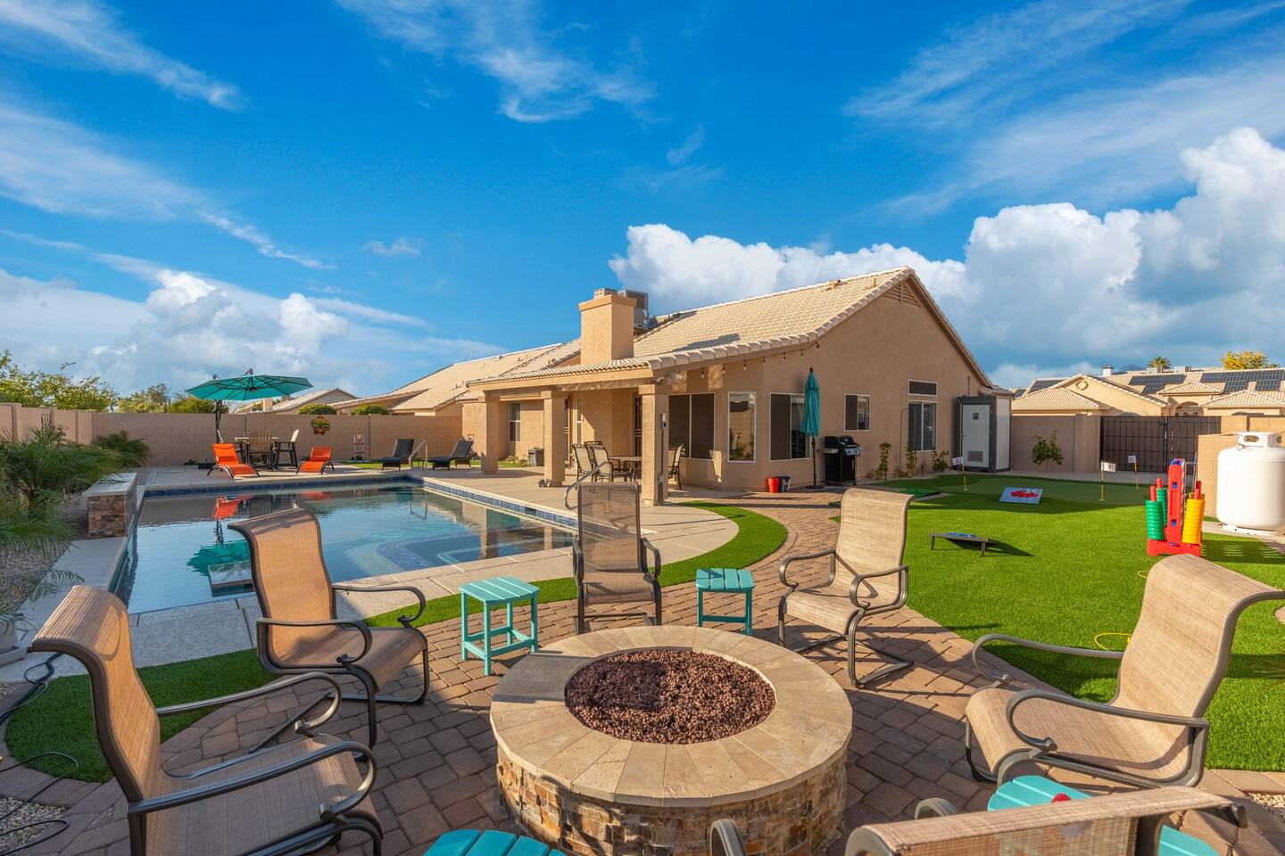 🏆Top 1% of airbnb listings in AZ, 30+ 5 Star reviews have raved about this home. "Desert Family Oasis" Family Oasis with a 5 Star-Resort style backyard! *Heated pool available, hot tub, golf putting green, gas fire pit, yard games, outdoor bathroom & much more! The stylish well-appointed home is in a quiet safe community in Mesa that boasts easy access to the highway. A full-time vacation rental, ideal for large families with kids-newborns, business travelers, solo adventurers & couples.