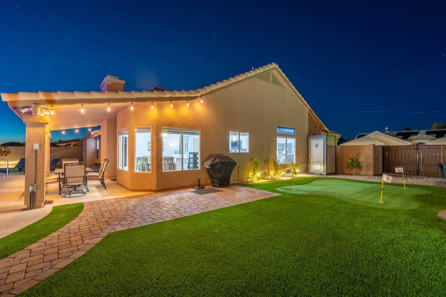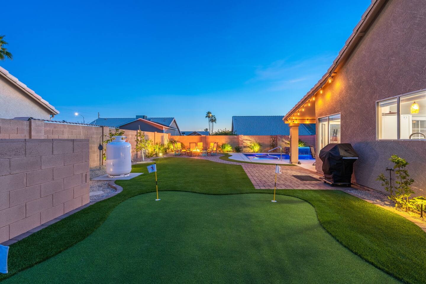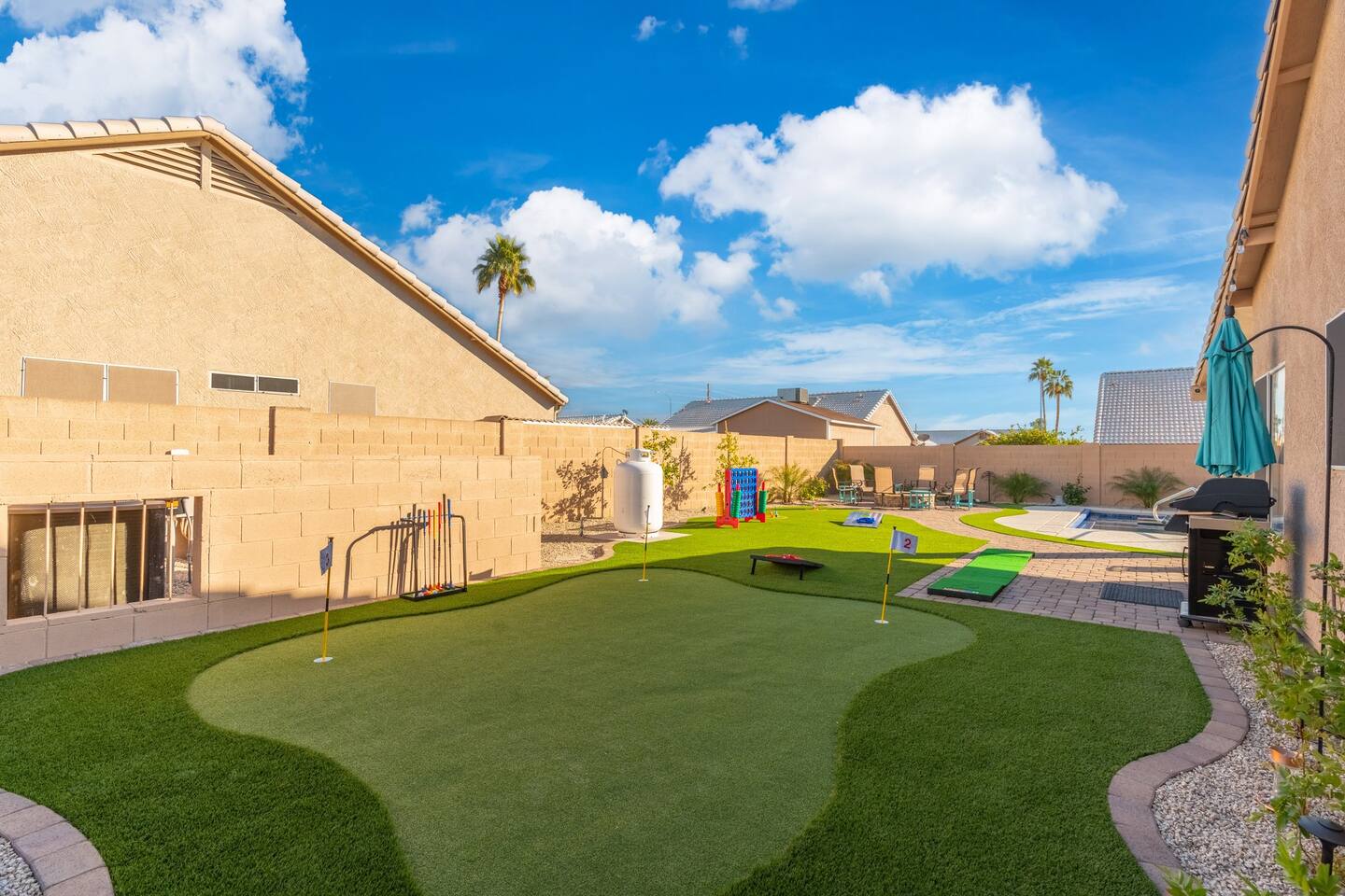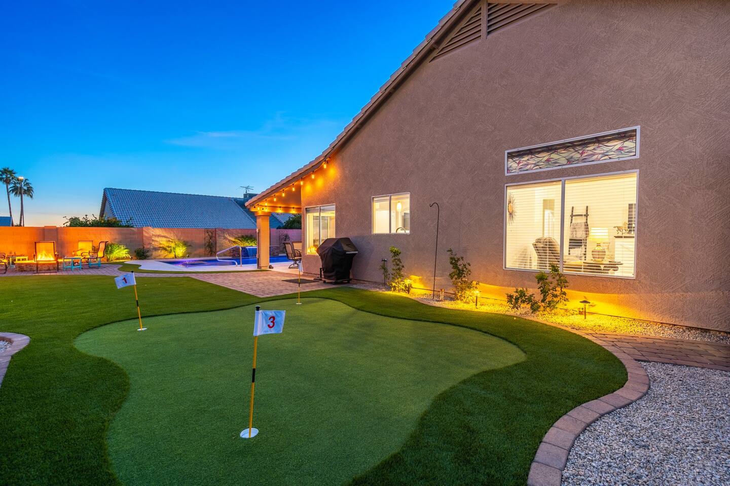 🏆Top 1% of airbnb listings in AZ, 30+ 5 Star reviews have raved about this home. "Desert Family Oasis" Family Oasis with a 5 Star-Resort style backyard! *Heated pool available, hot tub, golf putting green, gas fire pit, yard games, outdoor bathroom & much more! The stylish well-appointed home is in a quiet safe community in Mesa that boasts easy access to the highway. A full-time vacation rental, ideal for large families with kids-newborns, business travelers, solo adventurers & couples.
