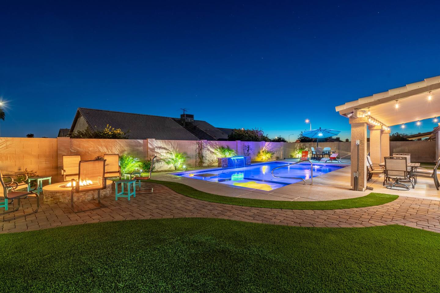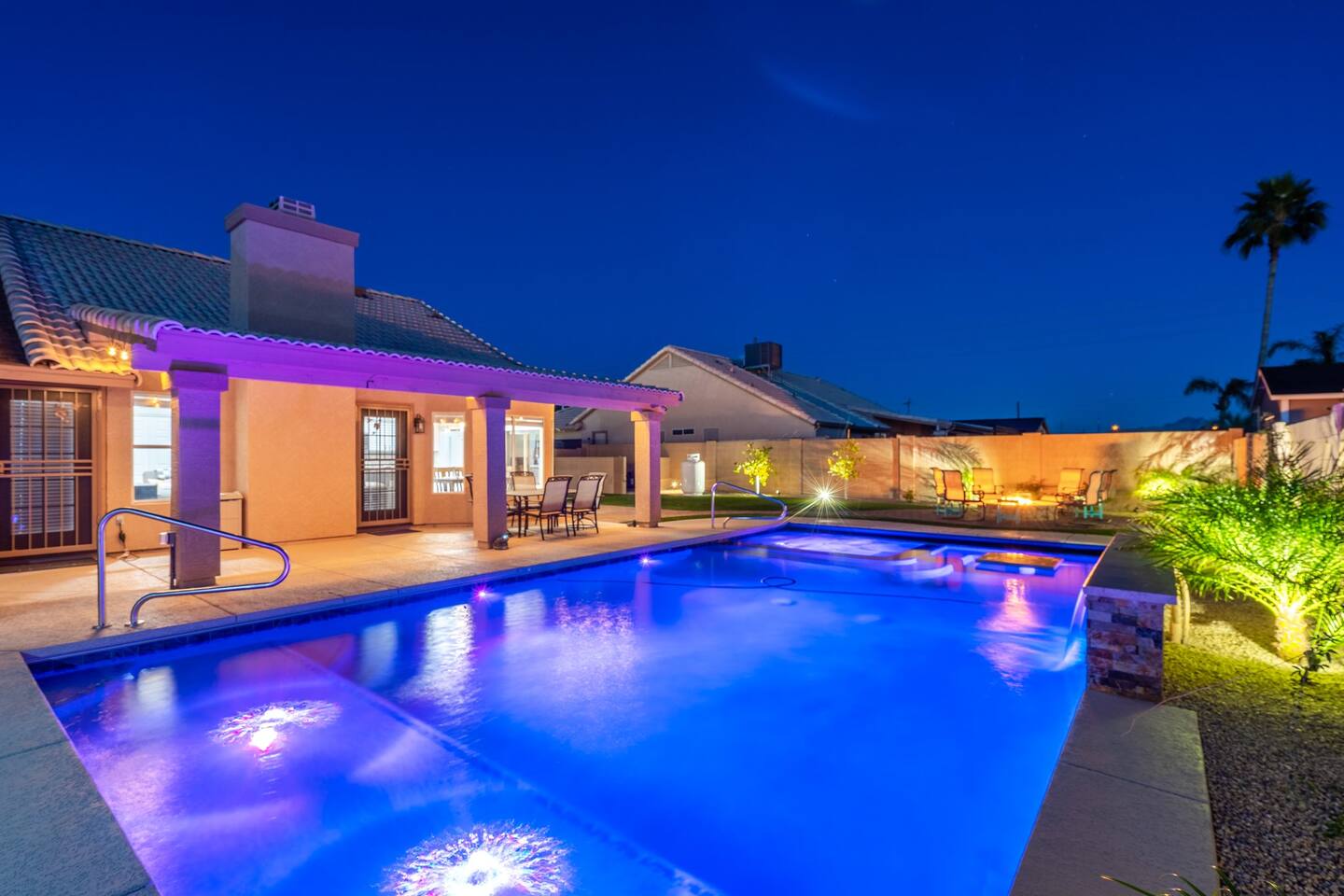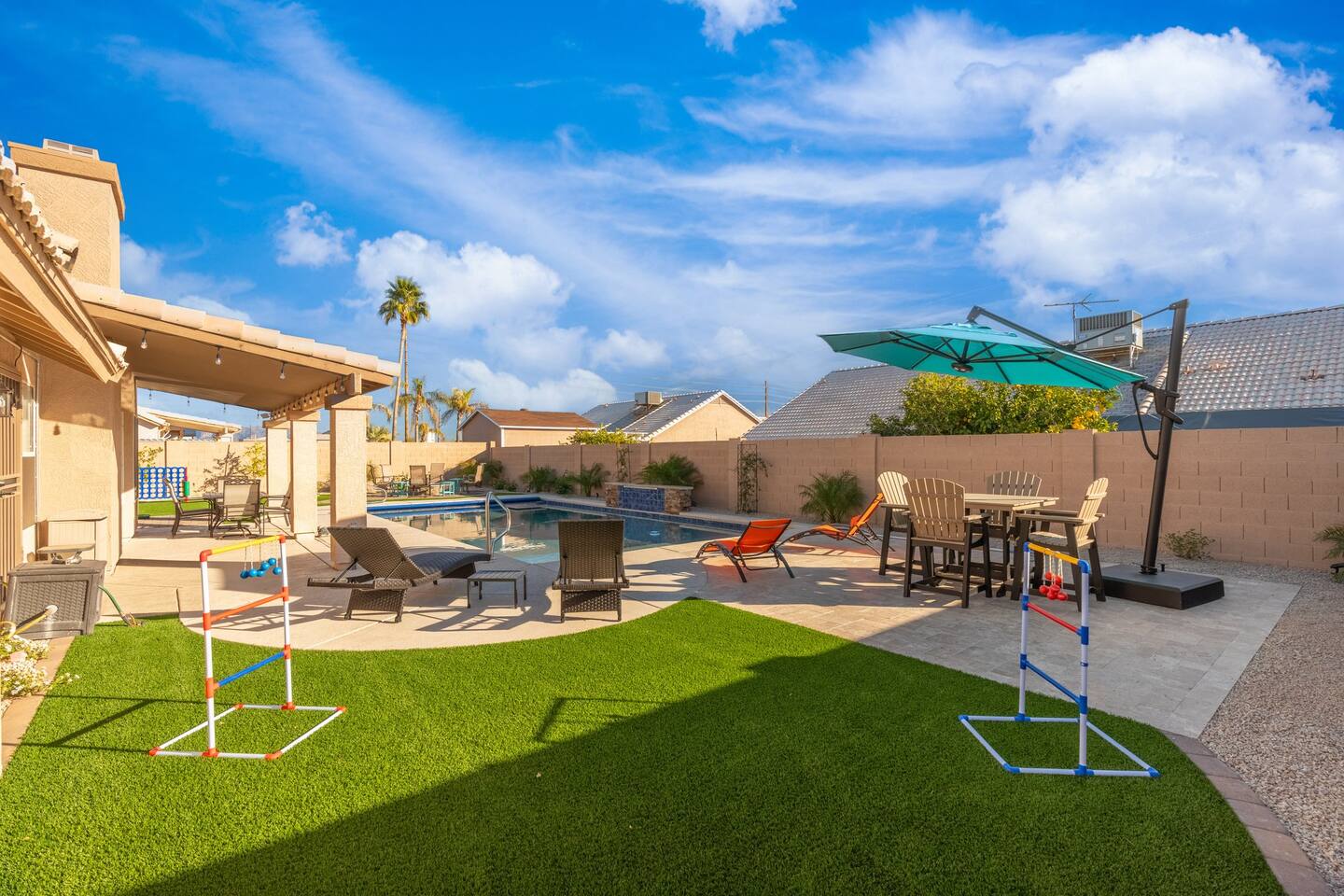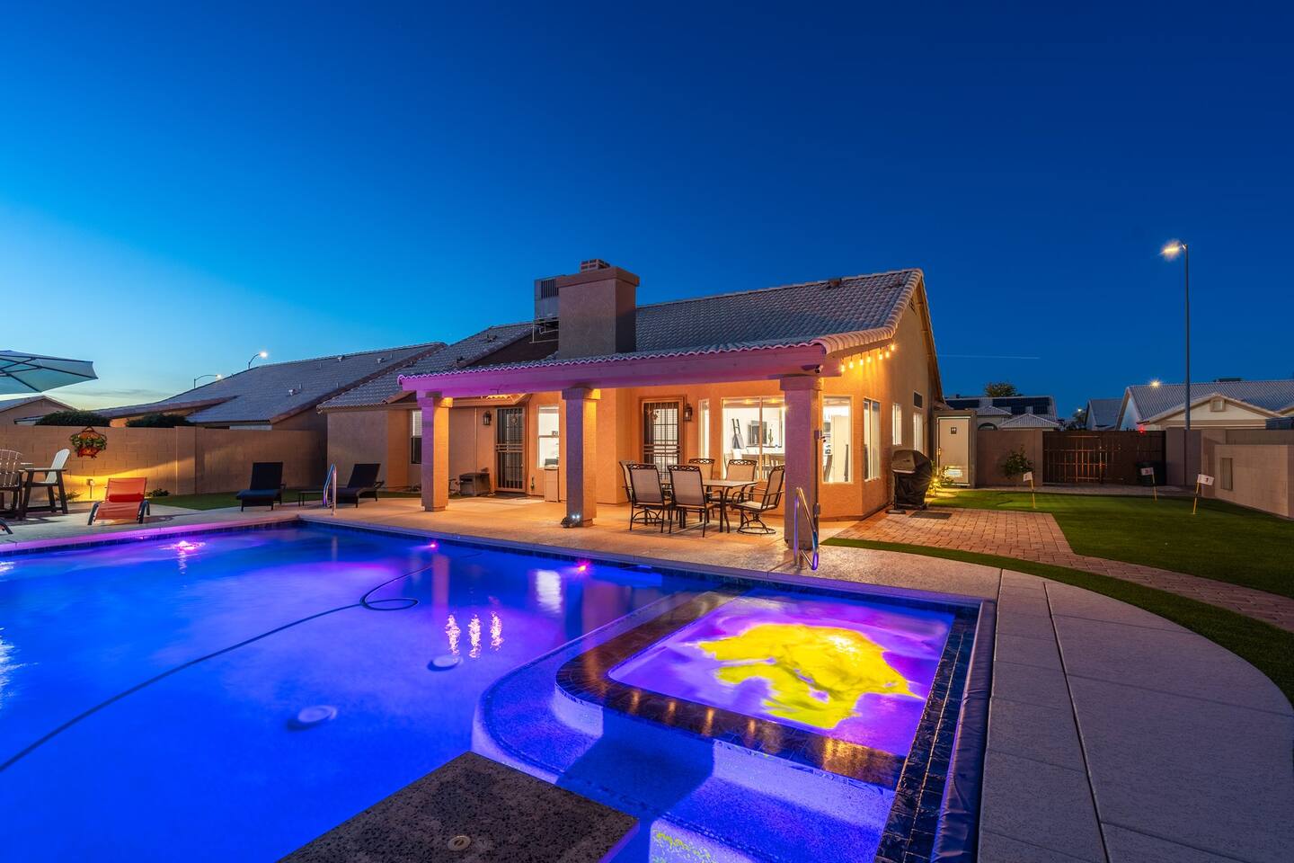 Looking for that family Oasis to call home while exploring Arizona, the search ends here! Unwind, make lifelong memories with family and friends in this cozy Mesa home with a backyard with all the amenities! This home features a brand new resort style pool, connected spa, Baja tanning ledge, table seating in the pool and LED changing pool lights that puts on a show at night. The backyard also features a gas firepit and golf putting green. The yard is spacious enough to play any yard games you desire and we provide several. *HEATED POOL: Pool heat is an additional charge of $60/ day & must be requested at the time of booking. The resort style pool features a custom fountain, a shallow Baja/tanning ledge & color changing led pool lights at night that put on a real show. This pool has all the cool technology! “Alexa, turn on pool theme 7.” All the pool modes aka themes can be controlled by just asking Alexa to turn them on! *SUMMER MONTHS: The pool equipment has the ability to cool the water down a bit so it’s more refreshing in Arizona summers. HOT TUB: Heating for this is provided no matter what. MASTER BEDROOM: The master bedroom has a king size mattress and an en-suite connected bathroom. 2ND & 3RD BEDROOMS: Both bedrooms have Queen size beds, closets and TV's. The living room cabinet underneath the tv also has a pullout Queen bed. (Queen cabinet bed) KITCHEN: The cook’s kitchen has an electric double oven for cooking, microwave, spices and much more for cooking large meals with the family. Make lasting memories & book a private chef with our concierge store. WIFI: Eero router for indoor & outdoor 5G WIFI. Enough speed for business Zoom meetings. WHY ME? 5-Star Professional Host- 100% Full time & Licensed Realtor if you need a home in AZ! 🏆40X Consecutive SuperHost since 2016 5-Star Host Store: Access to in-home massage’s, IV Drips to recover, bike & golf club rentals & much more. 5-STAR DIGITAL GUIDE: Loaded with all the great spots nearby & my Hidden Gems of the city! EXAMPLES Hidden gems tab: The Rusty Spur City Hall Steak house Bourbon & Bones steak house Dierks Bentley Bar & Grill Instant Book before the dates are gone or save the listing & tap the heart emoji!❤️ *HOT NEW LISTING ALERT: Professional host with 100’s of 5 star reviews! “This is the best host & Airbnb trip I’ve taken & I travel frequently.” “It’s obvious Matthew is a professional & this is the best experience I have had with Airbnb.” “I’d give more than 5 stars if possible & the location was perfect for our family trip!” WHO SHOULD BOOK? Families with kids & newborns: Pack N’ Play Crib, travel booster seat, child plates, Baja shallow ledge in pool for young ones, board games, books, puzzles & much more. Missing something you need? Let me know and we will do our best to accommodate. Business traveler friendly: Keypad Contactless Self-Check-in & checkout, 5G WIFI Router for blazing 5G internet speeds, Keurig Coffee stocked for the morning fuel & Torani syrups for a delicious latte. Avid travelers & explorers who like to be in their own compound, singles, golfers & sports minded individuals, mountain climbers. * No parties, birthday parties or unauthorized large gatherings are permitted at this property. The City of Mesa has a strict ordinance against nuisance gatherings at vacation rentals. WHY THIS HOME? Short Distance from Downtown Mesa with Amazing locally owned and operated Craft Breweries and Restaurants. Not far away is the vibrant downtown of Gilbert night life and shopping malls, take the 202 Red Mountain Freeway for fast 10 minute drive. PROPERTY HIGHLIGHTS *POOL HEAT: Additional $60 per day to heat the pool if requested. This must be requested and paid for at the time of booking. The heat will be active for the length of your stay. We suggest for a comfortable swim temperature to choose the pool heat option for travel dates in Oct-May 31st. CHILLER MODE: The pool can be cooled down a bit in the summer. POOL LIGHT: LED color changing lights are activated at sundown & will put on a show. OUTDOOR FIREPIT: Easy to use propane firepit. WIFI: 1 Gigabit Blazing Fast 5g 5G WIFI router for indoor & outdoor coverage. GAMES: Miniature Golf, Putter-Ball, Large JENGA, Ladder Toss, Ring Toss, Corn Hole INDOOR GAMES: Multiple Kid board games, Cards / chips, Kids cars and trucks, Fisher Price Laugh & Learn INFANTS: Please make sure to request these items so they are ready upon arrival. Pack n' Play travel crib, infant car seat, booster seat, child life jackets, etc. Need something else? Make a request & we will see what we can do. FOODIES: BBQ grill with propane for cooking & stocked spices. CLEANING: We have mandated an extensive sanitation & cleaning process. I’m one of the highest rated hosts in Arizona & my properties have more amenities than a high end hotel! *This property fills up fast so instant book before the dates are gone. TIP: If you like this beautiful property & want to save it to your favorites please click on the heart in the upper right hand corner.❤️ GUEST ACCESS Washer & dryer (Detergent provided) Pool towels (located in the laundry R.) Keurig Pro coffee: 1 cup or a pot Dishes, pots & pans, toaster, blender, etc. TVs controlled by the Roku app. GARAGE: Not available for guest use. INDOOR FIREPLACES: Easy instructions will be provided. OUTDOOR PROPANE FIREPIT: Easy instructions will be provided. Instant Book now before the dates are gone or save the listing & hit the heart emoji. ❤️ Thanks for looking & hope to host you soon! 🏆40X Consecutive SuperHost since 2016 TPT#: STR#: LIC24-09266