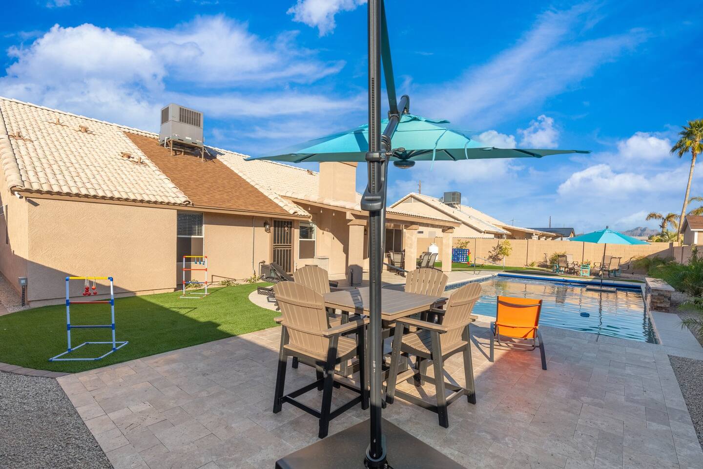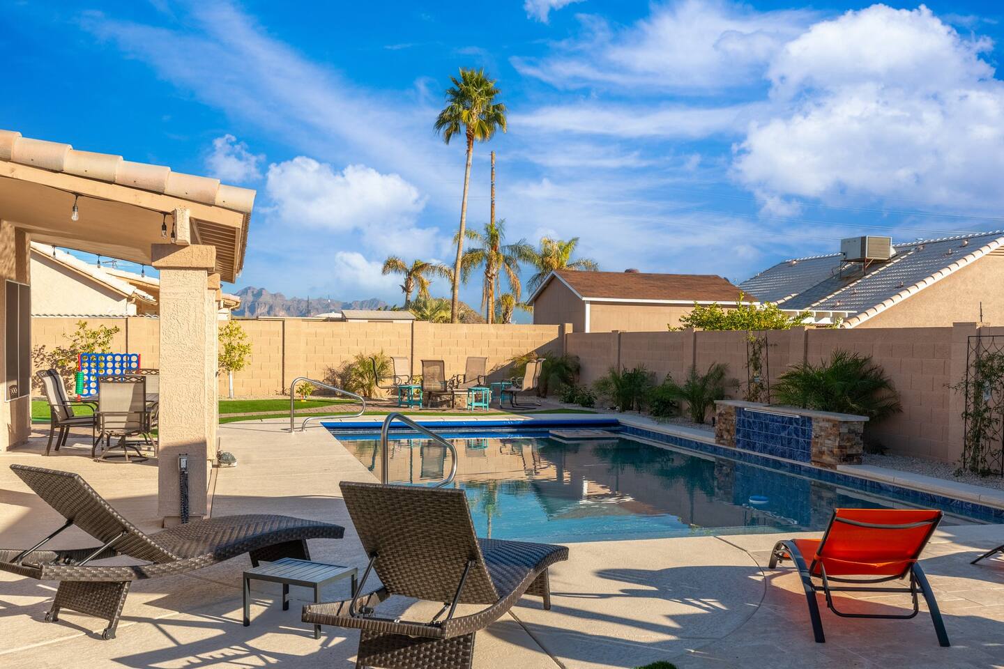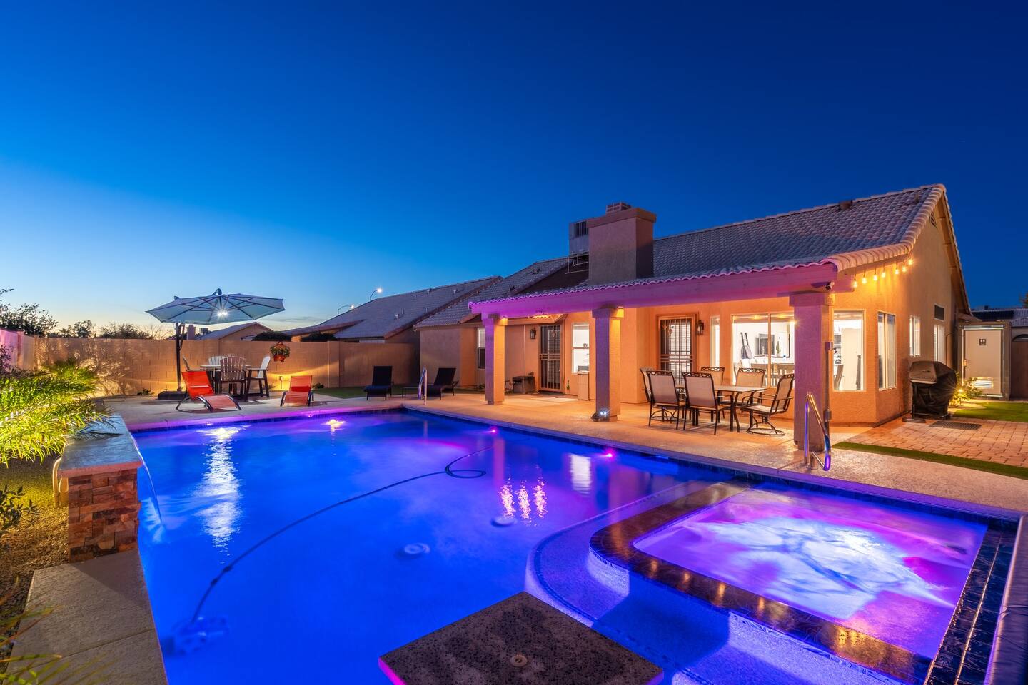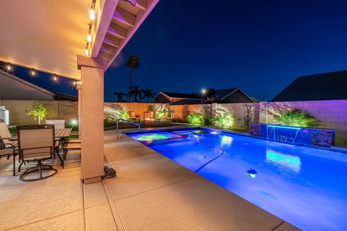 Looking for that family Oasis to call home while exploring Arizona, the search ends here! Unwind, make lifelong memories with family and friends in this cozy Mesa home with a backyard with all the amenities! This home features a brand new resort style pool, connected spa, Baja tanning ledge, table seating in the pool and LED changing pool lights that puts on a show at night. The backyard also features a gas firepit and golf putting green. The yard is spacious enough to play any yard games you desire and we provide several. *HEATED POOL: Pool heat is an additional charge of $60/ day & must be requested at the time of booking. The resort style pool features a custom fountain, a shallow Baja/tanning ledge & color changing led pool lights at night that put on a real show. This pool has all the cool technology! “Alexa, turn on pool theme 7.” All the pool modes aka themes can be controlled by just asking Alexa to turn them on! *SUMMER MONTHS: The pool equipment has the ability to cool the water down a bit so it’s more refreshing in Arizona summers. HOT TUB: Heating for this is provided no matter what. MASTER BEDROOM: The master bedroom has a king size mattress and an en-suite connected bathroom. 2ND & 3RD BEDROOMS: Both bedrooms have Queen size beds, closets and TV's. The living room cabinet underneath the tv also has a pullout Queen bed. (Queen cabinet bed) KITCHEN: The cook’s kitchen has an electric double oven for cooking, microwave, spices and much more for cooking large meals with the family. Make lasting memories & book a private chef with our concierge store. WIFI: Eero router for indoor & outdoor 5G WIFI. Enough speed for business Zoom meetings. WHY ME? 5-Star Professional Host- 100% Full time & Licensed Realtor if you need a home in AZ! 🏆40X Consecutive SuperHost since 2016 5-Star Host Store: Access to in-home massage’s, IV Drips to recover, bike & golf club rentals & much more. 5-STAR DIGITAL GUIDE: Loaded with all the great spots nearby & my Hidden Gems of the city! EXAMPLES Hidden gems tab: The Rusty Spur City Hall Steak house Bourbon & Bones steak house Dierks Bentley Bar & Grill Instant Book before the dates are gone or save the listing & tap the heart emoji!❤️ *HOT NEW LISTING ALERT: Professional host with 100’s of 5 star reviews! “This is the best host & Airbnb trip I’ve taken & I travel frequently.” “It’s obvious Matthew is a professional & this is the best experience I have had with Airbnb.” “I’d give more than 5 stars if possible & the location was perfect for our family trip!” WHO SHOULD BOOK? Families with kids & newborns: Pack N’ Play Crib, travel booster seat, child plates, Baja shallow ledge in pool for young ones, board games, books, puzzles & much more. Missing something you need? Let me know and we will do our best to accommodate. Business traveler friendly: Keypad Contactless Self-Check-in & checkout, 5G WIFI Router for blazing 5G internet speeds, Keurig Coffee stocked for the morning fuel & Torani syrups for a delicious latte. Avid travelers & explorers who like to be in their own compound, singles, golfers & sports minded individuals, mountain climbers. * No parties, birthday parties or unauthorized large gatherings are permitted at this property. The City of Mesa has a strict ordinance against nuisance gatherings at vacation rentals. WHY THIS HOME? Short Distance from Downtown Mesa with Amazing locally owned and operated Craft Breweries and Restaurants. Not far away is the vibrant downtown of Gilbert night life and shopping malls, take the 202 Red Mountain Freeway for fast 10 minute drive. PROPERTY HIGHLIGHTS *POOL HEAT: Additional $60 per day to heat the pool if requested. This must be requested and paid for at the time of booking. The heat will be active for the length of your stay. We suggest for a comfortable swim temperature to choose the pool heat option for travel dates in Oct-May 31st. CHILLER MODE: The pool can be cooled down a bit in the summer. POOL LIGHT: LED color changing lights are activated at sundown & will put on a show. OUTDOOR FIREPIT: Easy to use propane firepit. WIFI: 1 Gigabit Blazing Fast 5g 5G WIFI router for indoor & outdoor coverage. GAMES: Miniature Golf, Putter-Ball, Large JENGA, Ladder Toss, Ring Toss, Corn Hole INDOOR GAMES: Multiple Kid board games, Cards / chips, Kids cars and trucks, Fisher Price Laugh & Learn INFANTS: Please make sure to request these items so they are ready upon arrival. Pack n' Play travel crib, infant car seat, booster seat, child life jackets, etc. Need something else? Make a request & we will see what we can do. FOODIES: BBQ grill with propane for cooking & stocked spices. CLEANING: We have mandated an extensive sanitation & cleaning process. I’m one of the highest rated hosts in Arizona & my properties have more amenities than a high end hotel! *This property fills up fast so instant book before the dates are gone. TIP: If you like this beautiful property & want to save it to your favorites please click on the heart in the upper right hand corner.❤️ GUEST ACCESS Washer & dryer (Detergent provided) Pool towels (located in the laundry R.) Keurig Pro coffee: 1 cup or a pot Dishes, pots & pans, toaster, blender, etc. TVs controlled by the Roku app. GARAGE: Not available for guest use. INDOOR FIREPLACES: Easy instructions will be provided. OUTDOOR PROPANE FIREPIT: Easy instructions will be provided. Instant Book now before the dates are gone or save the listing & hit the heart emoji. ❤️ Thanks for looking & hope to host you soon! 🏆40X Consecutive SuperHost since 2016 TPT#: STR#: LIC24-09266